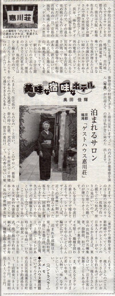 My Vision When I set out to refurbish my husband's parent's home. I wished to turn it into an intimate retreat where I could spend time with my beloved family, close friends, and neighbors. Now, my dream has come true. This three-year old remodeled guesthouse contains all the features I envisioned: the smell of Kyoto wood, family heritage furnishings, and most importantly, heartfelt hospitality for all. KEISENSOU offers you not only a functional space, but also a memorable once-in-a-lifetime Kyoto experience. Please visit our guesthouse for truly special moments.